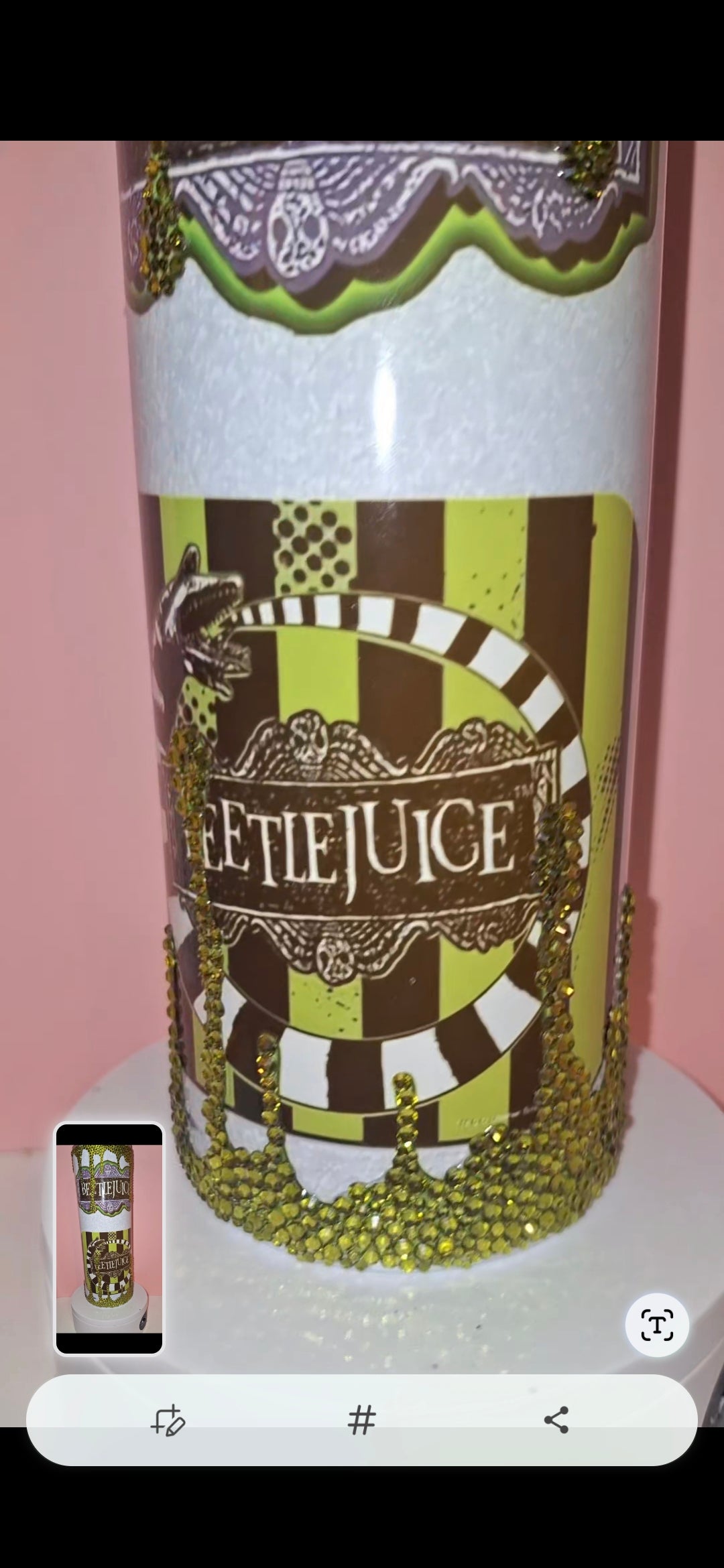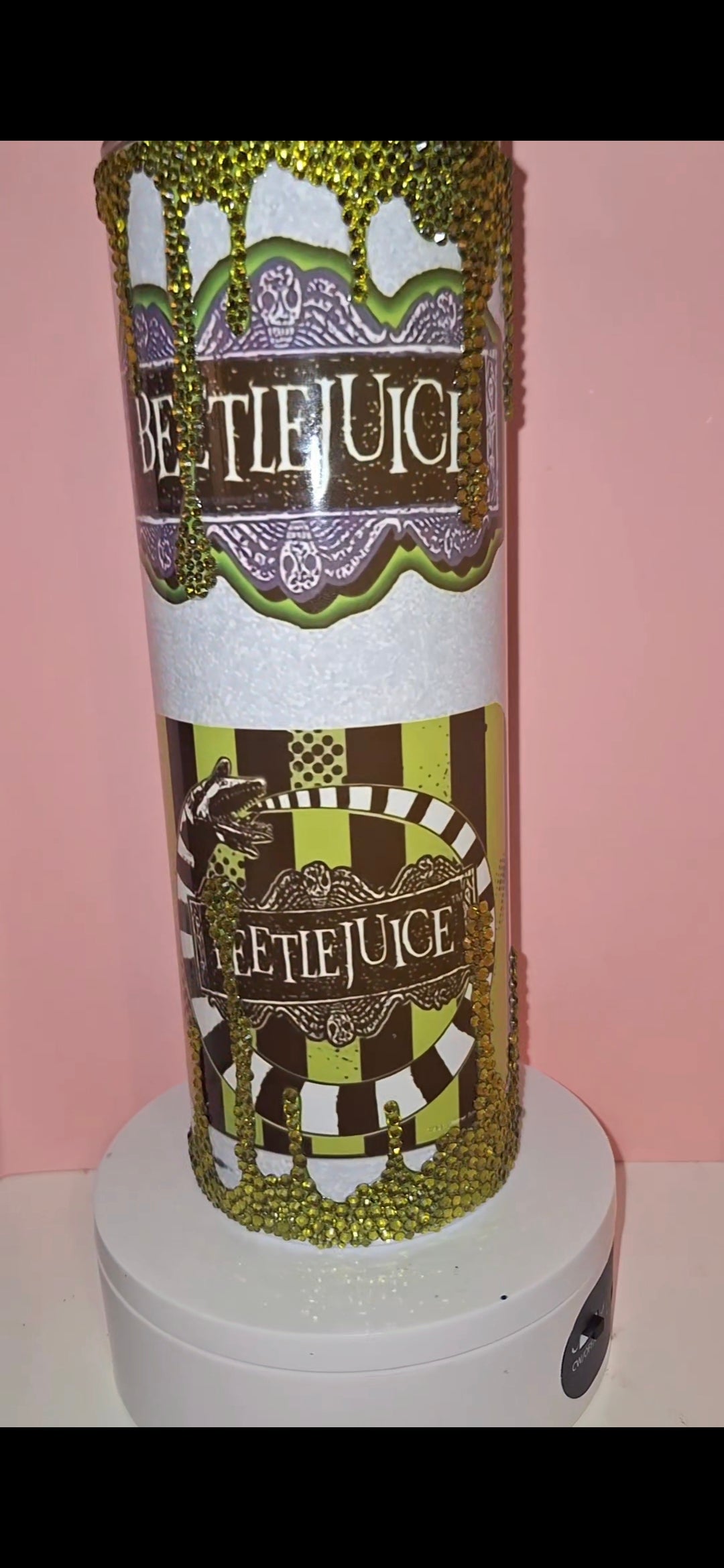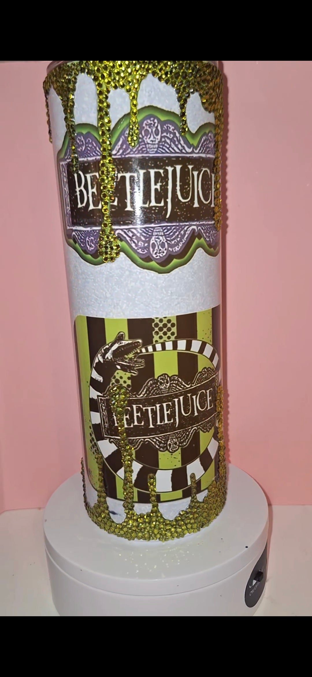 Indulge in luxury with our 20oz Beetle Juice tumbler, adorned with sparkling rhinestones. Keep your beverages at the perfect temperature while making a statement with this exclusive accessory. Whether on-the-go or relaxing at home, this tumbler adds a touch of sophistication to any occasion. sublimation tumbler with a touch of sparkle